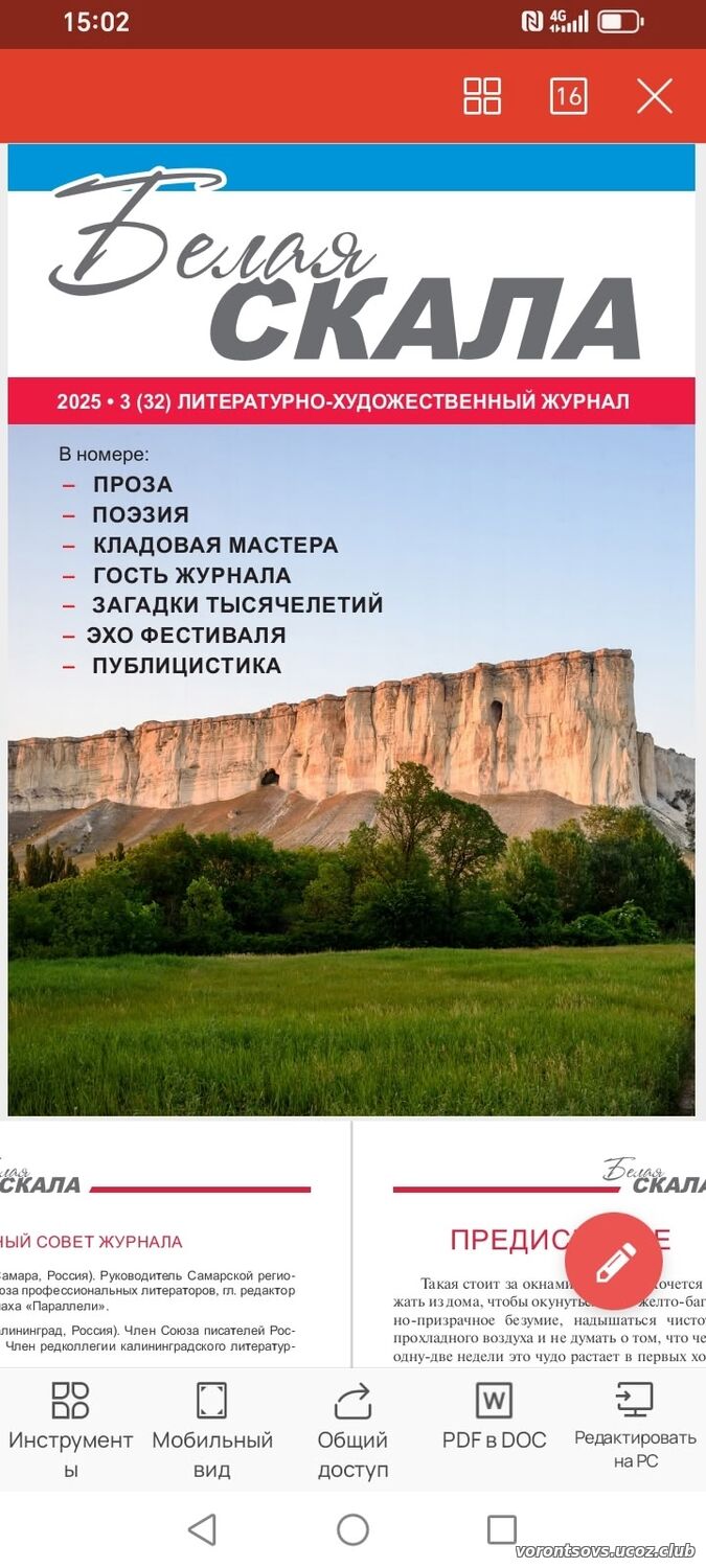 ![]() Поздравляем нашего автора, Марину Воронцову, с дебютной публикацией в литературно-художественном журнале "Белая скала". Благодарим редакцию за внимание к творчеству и публикацию. С очередным номером журнала можно ознакомиться на сайте Союза писателей Крыма по ... Читать дальше » |
